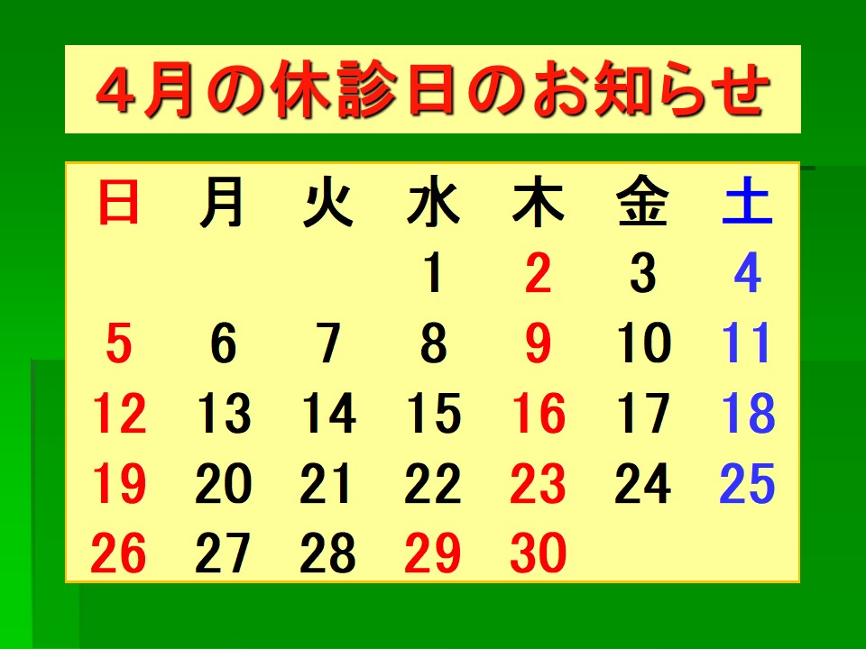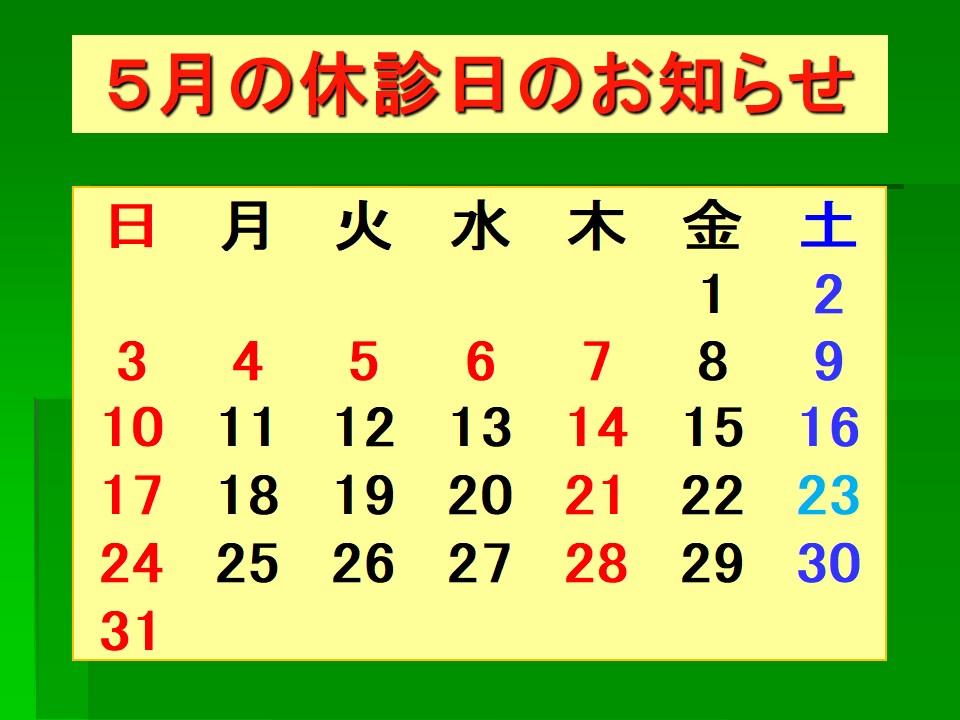 TOP > お知らせ一覧 > 4月5月の休診日のお知らせ