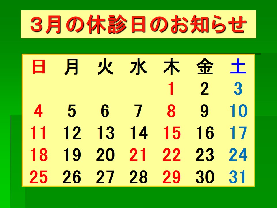 木 日 祝はお休み。土曜日は17時まで診療です。